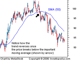 The graph below shows a stock price rising faster than its moving average in the first 25 days, approximately, then as shown by the arrow, the actual price breaks through the moving average. As it relates to technical analysis to support a buy/hold/sell decision for an equity position, which of the following statements is most reasonable at the point in time represented by the arrow?
