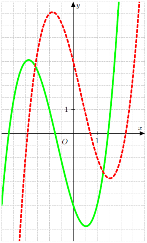 Considérons la fonction f représentée en trait continu vert et la fonction