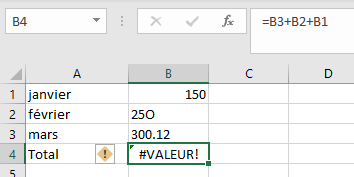 Pourquoi la formule en B4 affiche #VALEUR! ?