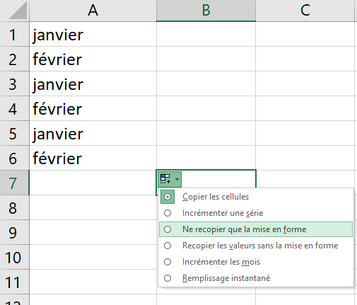 Je sélectionne A1:A2 puis je recopie vers le bas pour obtenir la répétition janvier février, quelle option devrai-je choisir ?