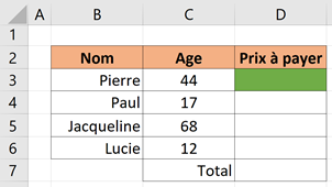 L’entrée au parc d’attraction affiche une liste de prix en fonction de l’âge. Afin de calculer le prix total à payer, on doit déterminer le prix à payer pour chaque personne. Quelle est la bonne formule à utiliser dans la cellule D3 ? Prix des entrées en fonction de l’âge : - 17 ans = 6 € / De 17 à 63 = 12 € / + de 63 ans = 8 €.