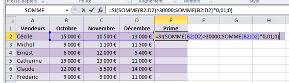 Ce tableau ci-dessous contient les ventes du trimestre par vendeur. J'entre dans la cellule E2 la formule suivante que je recopierai ensuite afin de calculer la prime de chacun : =SI(SOMME(B2:D2)>=30000;SOMME(B2:D2)*0,01;0) Que signifie cette formule ?