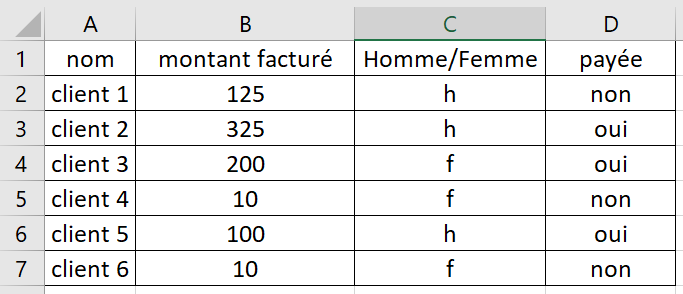 Pour calculer le nombre de factures non payées (colonne D), j'utilise la fonction :