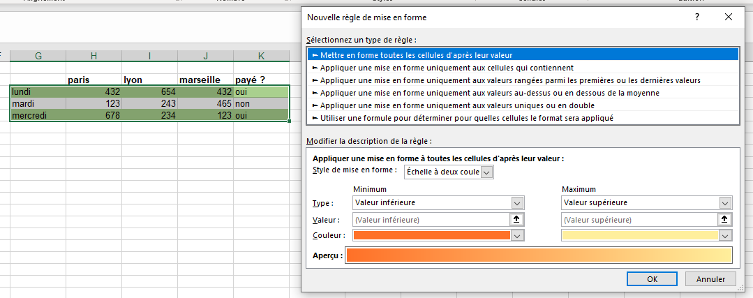 J'ai créé une mise en forme conditionnelle qui met en vert les cellules du tableau si l'entreprise a payé ses factures, (condition en colonne K) j'ai utilisé ?