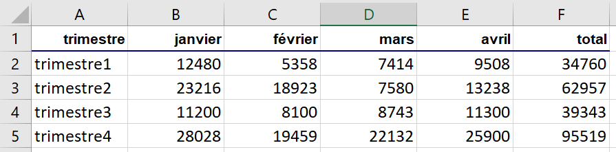 Je veux créer un graphique en histogramme montrant le résultat de mes ventes par trimestre et par mois, je sélectionne :