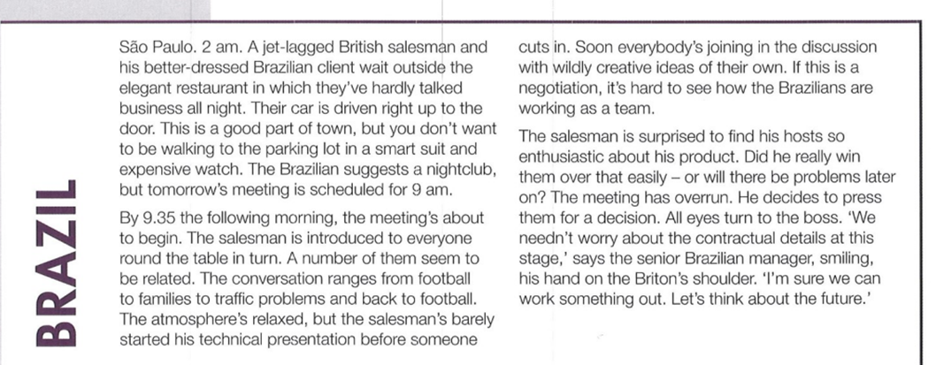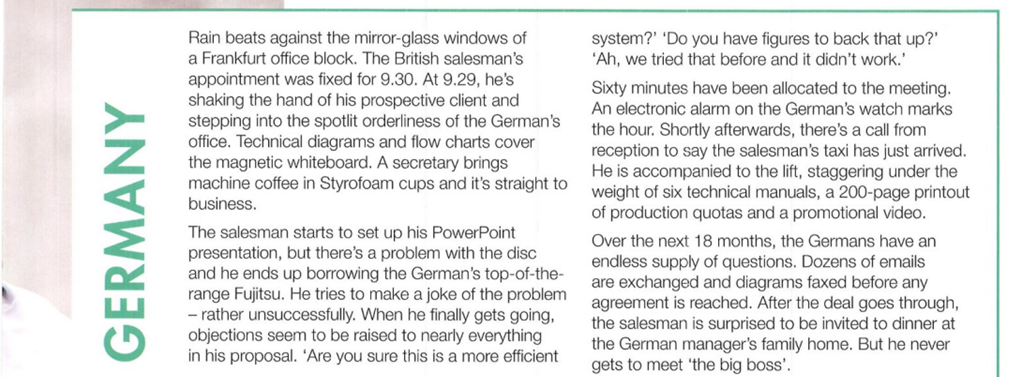 Based on the texts about the salesman's visits, identify the country that the statements describe.