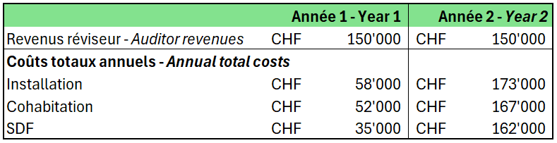 Avant de se lancer, Florian se demande s'il ne devrait pas adopter une stratégie tarifaire plus agressive pour s’imposer plus facilement sur le marché.Si ses tarifs horaires étaient ajustés à CHF 100 pour la tenue de la comptabilité et la déclaration d'impôts, CHF 150 pour la révision et CHF 200 pour les différents conseils, avec un mix de {1; 1; 1}, quel serait le point d’indifférence en nombre d'heures pour la première année dans le scénario "Installation" ?