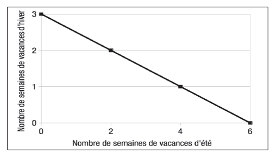Voici un graphique représentant la droite de budget de Maxime, on note X1 le nombre des semaines de vacances d’été et X2 le nombre de semaines de vacances d’hiver. Sachant que son budget est de 4 500 euros, quelle est l’expression de la contrainte budgétaire ?