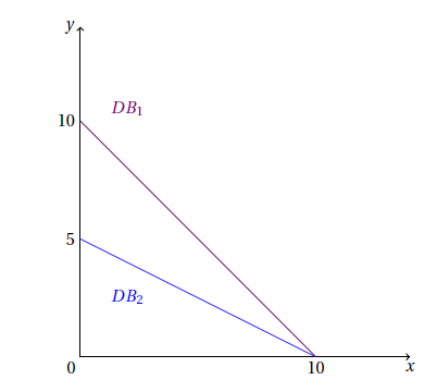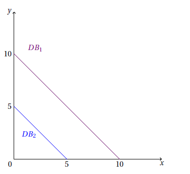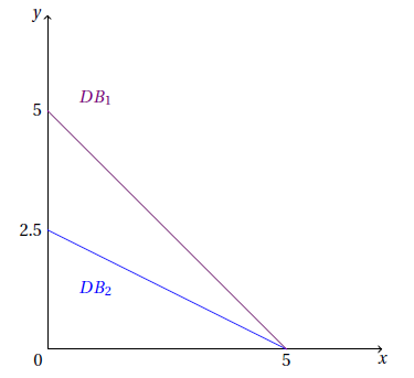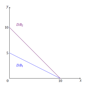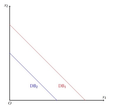 Soit DB1 la droite de budget avant évolution du revenu du consommateur, et DB2 la droite de budget après évolution du revenu du consommateur. À partir du graphique présenté ci-dessous, laquelle des affirmations suivantes est vraie ?