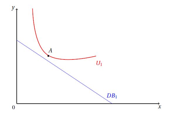 Soit la courbe d'indifférence qui représente les préférences du consommateur 1 et sa droite de budget.