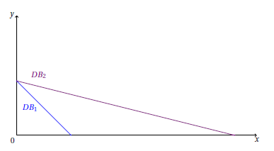 Le graphique ci-dessus représente deux droites de budget (DB1 pour la situation 1 et DB2 pour la situation 2) pour les deux biens (x et y). Laquelle des propositions suivantes est vraie ?