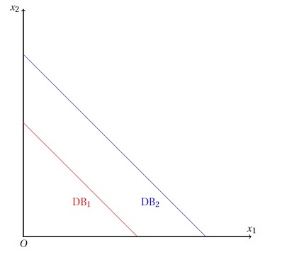 Soit DB1 la droite de budget avant évolution du revenu du consommateur, et DB2 la droite de budget après évolution du revenu du consommateur. À partir du graphique présenté ci-dessous, laquelle des affirmations suivantes est vraie ?