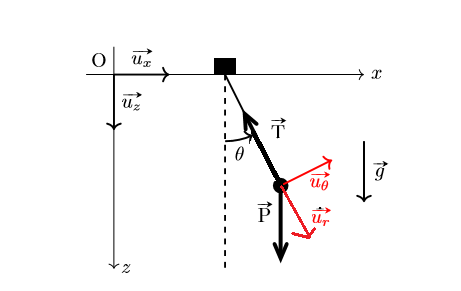 Considérons la masse accroché à un fil subissant son poids et la tension du fil représentés sur le schéma suivant.