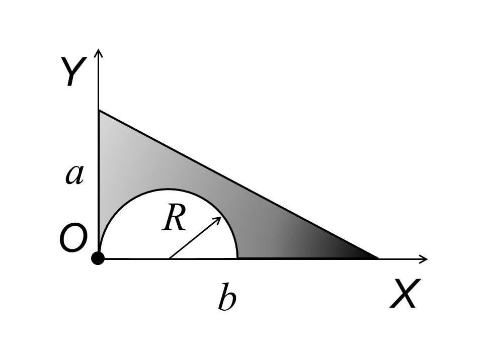 Calcular el centro de masas de la lámina homogénea de la figura de densidad 1,4 kg/m3 constante y dimensiones a=5,7 m, b=9,7 m y R=1 m.