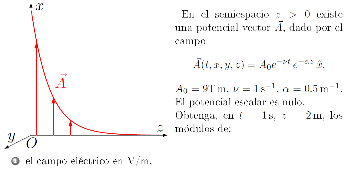 Se considera un punto P, sobre el eje x, de coordenadas esféricas , en el que existe, para , un campo de inducción magnética constante . Suponiendo que la velocidad de la luz es c,