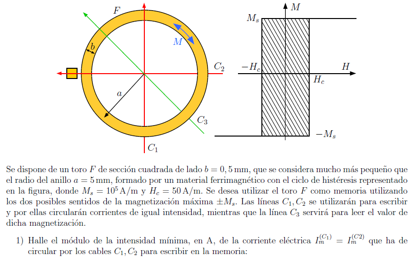 Un disco metálico con 0,5m de radio y centro C puede girar en torno a su eje de revolución Cz en presencia de una inducción magnética uniforme y constante , donde =2T. Dos conductores filiformes, de resistencia despreciable, conectan los puntos F,G con el centro y la periferia del disco cuando éste gira (disco de Faraday) con una velocidad de 10 rad/s. La resistencia que se mide desde los terminales F,G es 10.