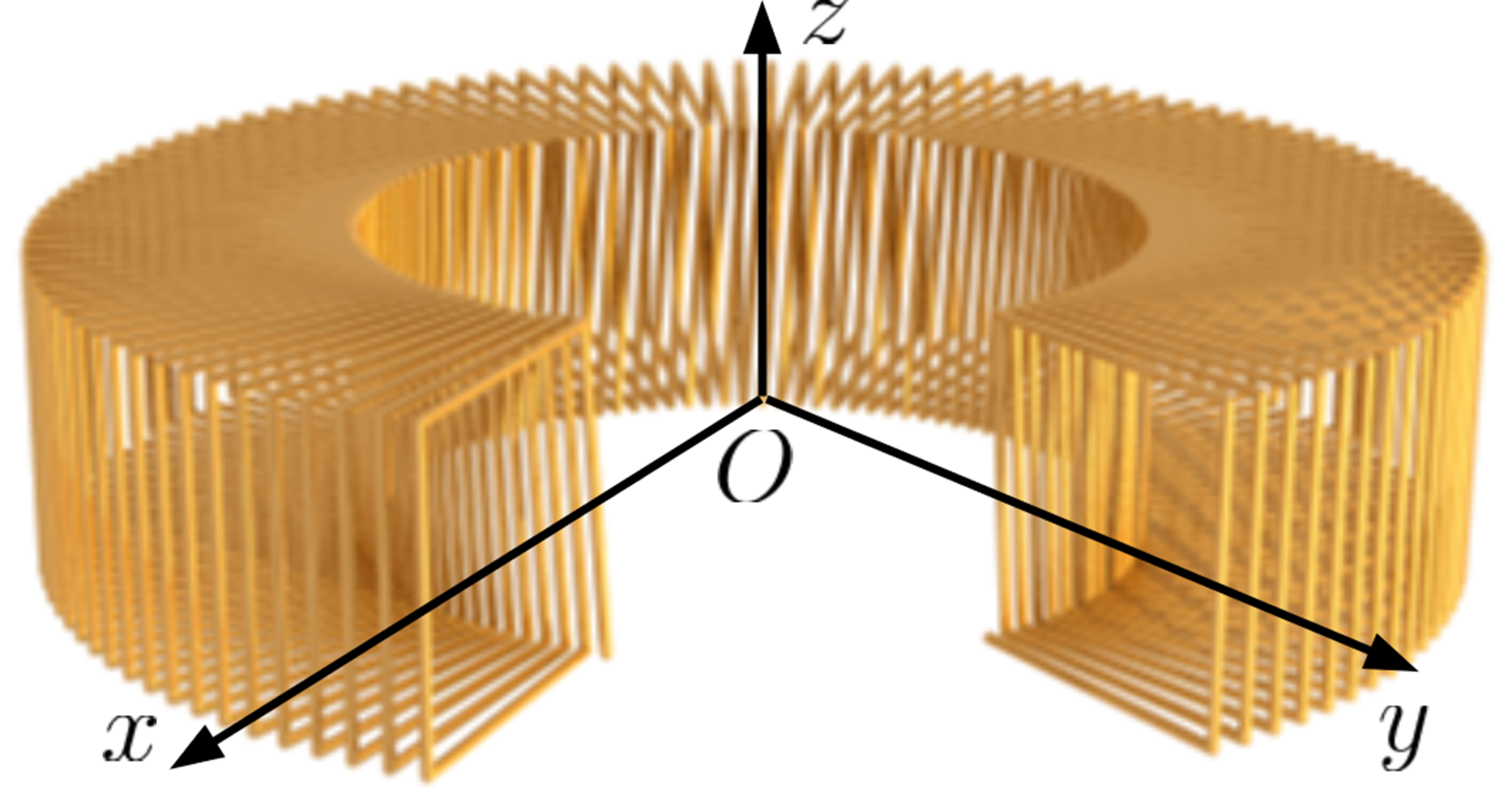 Un solenoide como el de la figura presenta una sección cuadrada de 20cm de lado y unas distancias al eje z máxima y mínima de 50 y 30 cm, respectivamente. Un bobinado de 100 vueltas se encuentra uniformemente distribuido sobre el núcleo del solenoide y lleva una corriente de A. En el interior el medio presenta una permeabilidad relativa de 100. Determine, en valor absoluto,