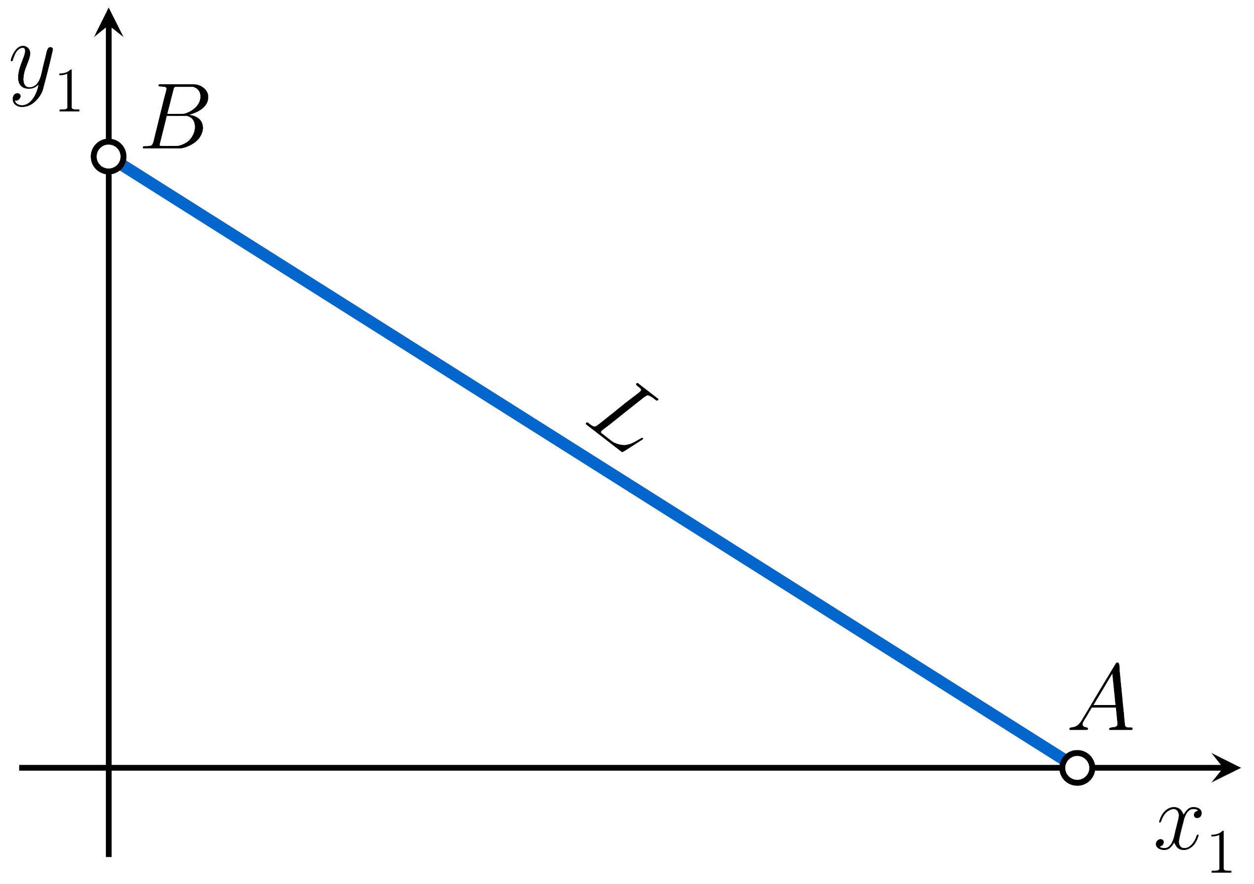 | Una varilla de longitud L=12.9 m con extremos A y B se mueve de modo que el extremo A desliza sobre el eje x1 y el extremo B sobre el eje y1. Sabiendo que cuando la coordenada del extremo A es xA=6.3 m su velocidad es vA=3.5 m/s determine la velocidad vB del extremo B en dicho instante. |