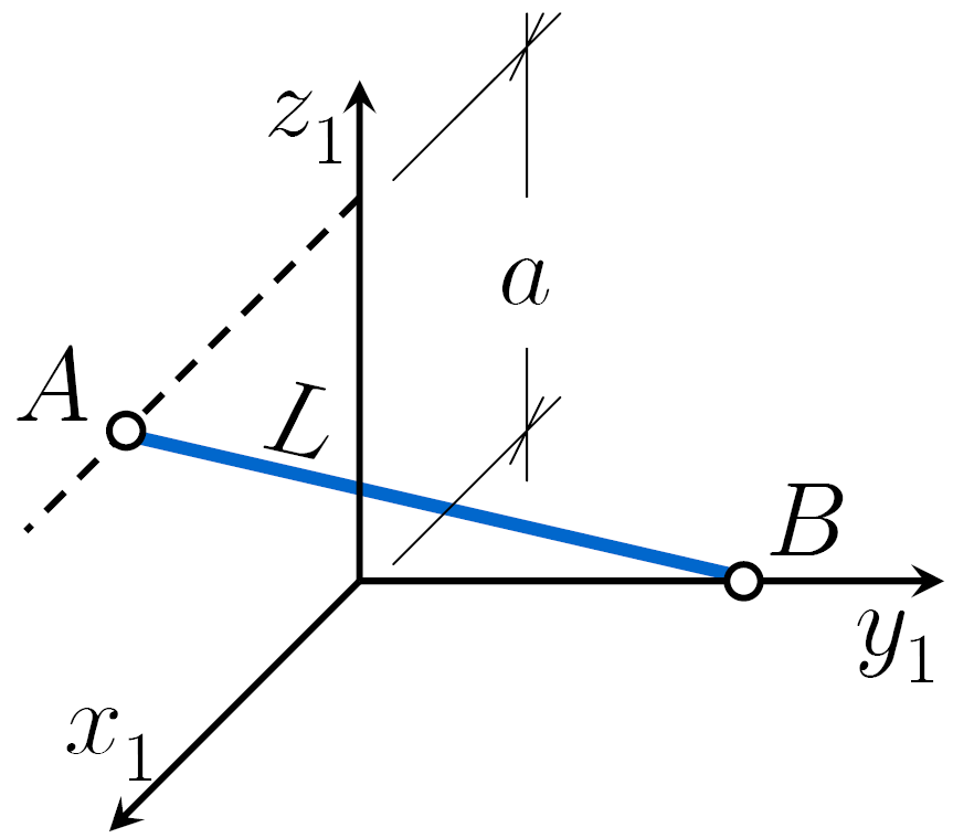 | Una barra rígida se mueve de modo que su extremo A desliza sobre una línea paralela al eje x1 y su extremo B desliza sobre el eje y1. Sabiendo que, en un instante dado, el módulo de la velocidad de A es 3.0 m/s, que las coordenadas del extremo A son (a,0,a) y las del extremo B son (0,a,0) (siendo a=8.7 m), se pide determinar el módulo de la velocidad del extremo B. |