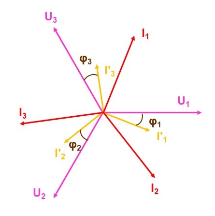 En un sistema trifásico equilibrado, si la primera tensión compuesta tiene como ángulo cero, la primera intensidad de línea (I) tiene como ángulo (90 – φ), siendo φ el ángulo del factor de potencia del receptor .