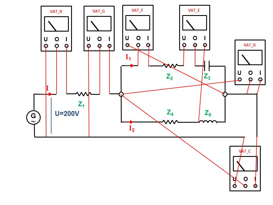Indicar el vatímetro que está conectado correctamente para medir la potencia activa del conjunto de receptores de la derivación (o circuito en paralelo: Z2+Z3+Z4+Z5). Supóngase la no existencia del resto de vatímetros y la continuidad de los conductores en los sitios en donde éstos están conectados.