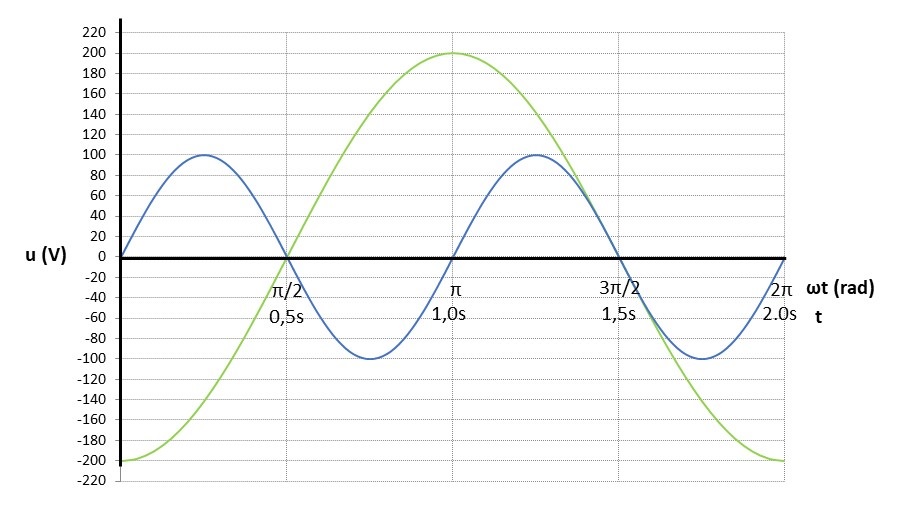 La amplitud y valor eficaz de la tensión representada en verde es: