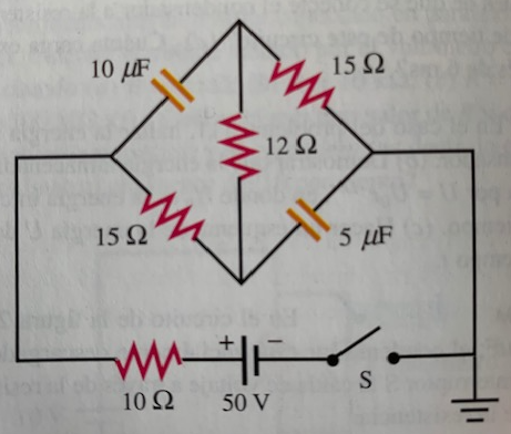 Suponiendo que los condensadores del circuito de la figuar están descargados inicialmente, cerramos el interruptor S y en t=0 se verifica que