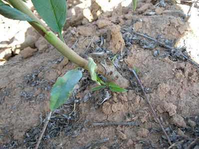 Esta planta se encuentra en el campo donde tuvo lugar el enraizamiento de la estaca del patrón, injerto de la variedad y crianza durante un año de la variedad. Por tanto, cuando se venda esta planta el patrón tendrá 2 años y la variedad 1.