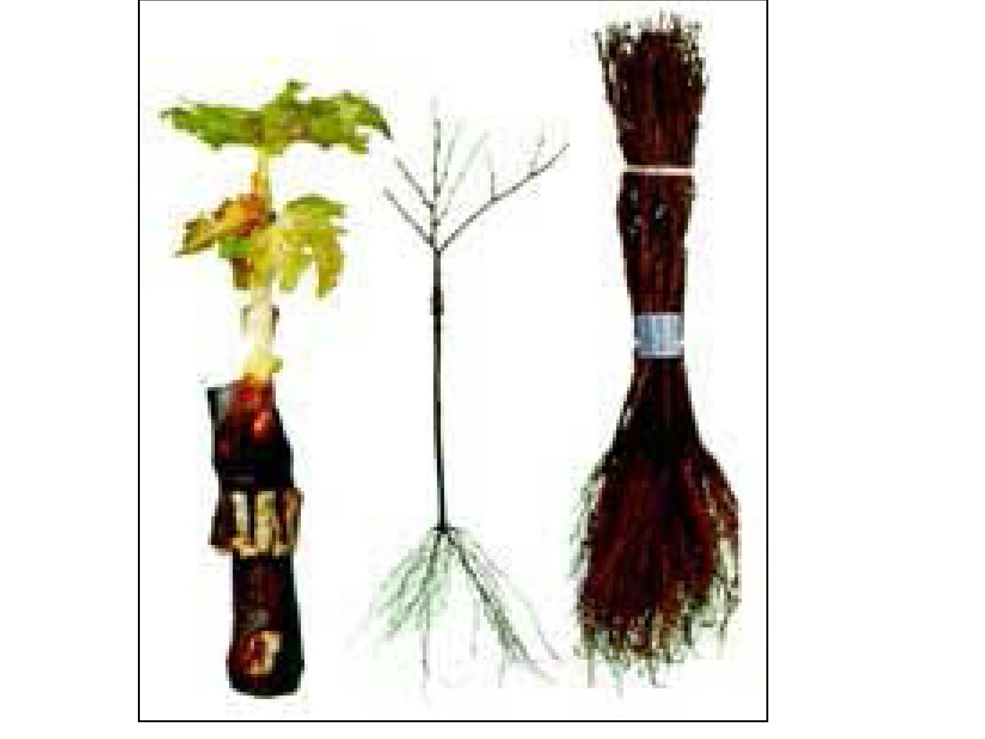 Un ingeniero que dirige una finca puede plantar el patrón sin injertar (dcha) e injertar posteriormente con yemas de variedad que le interese. También puede comprar la planta injertada, normalmente a raíz desnuda (centro) por ser mas barata y fácil de plantar. Con la limitación que hay que plantarla durante la parada vegetativa (otoño-inicio primavera). La planta en cepellón (izq) se utiliza para reponer aquellas plantas que hayan muerto (reposición de marras).