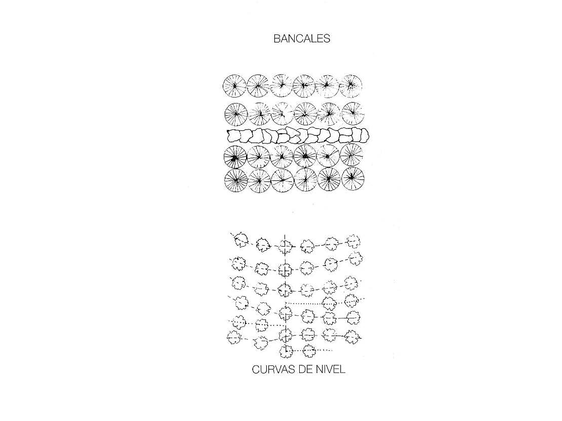 La plantación en curvas de nivel es mas barata que en bancales. En unos años el movimiento de tierra por el laboreo consigue que se formen pequeños bancales