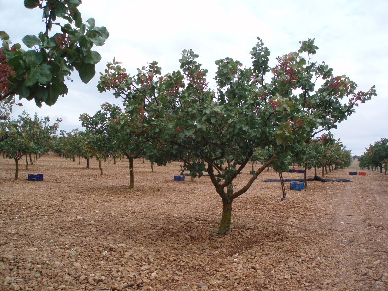 Plantación de pistacho de la foto esta formada en vaso abierto para una adecuada iluminación de la zona central de la copa. El marco de plantación es de 5x3 m