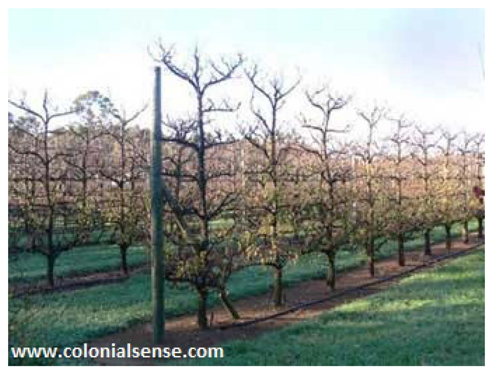 Para conseguir una copa bien iluminada se puede construir un seto continuo y estrecho. En esta finca al acercar demasiado los árboles las raices compiten y se reducen las producciones