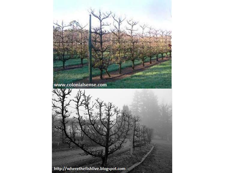 El manzano puede formarse en palmeta (arriba) y candelabro (abajo), sin embargo el sistema de conducción es en seto.