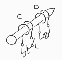 Ühele ja samale raudnaelale on keritud kaks pooli C ja D. Lüliti L sulgemisega lülitatakse vool poolis C sisse. Kirjeldage poolis D tekkiva induktsioonivoolu suunda ja selle voolu magnetvälja suunda. Milline on pooli D kui vooluallika polaarsus (+ ja –)? Kas kaks pooli tõmbuvad või tõukuvad? Miks? Valikvastuste õigeks märkimisel eeldage, et me vaatame piki naela vasakult alt (naelapea poolt) naela teraviku suunas.