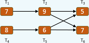 Tööbrigaad lõpetab järgnevas graafiga kirjeldatud projekti vähima võimaliku ajaga. Kui töö T pikkus lüheneb 7-lt 4-le, siis milline on maksimaalne aeg, mille võrra võib lüheneda kogu projekti täitmise aeg?