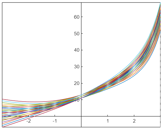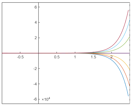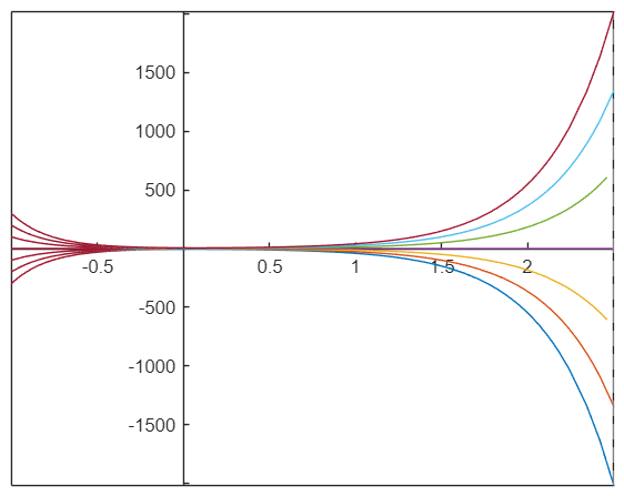 Nubrėžkite diferencialinės lygties atsakymą atkarpoje nuo -1 iki 2,5 ir pasirinkite taisyklingą atsakymą.