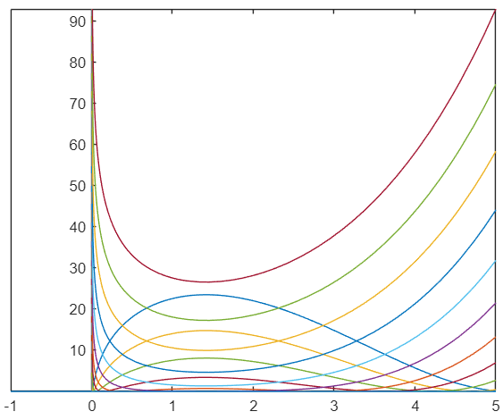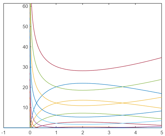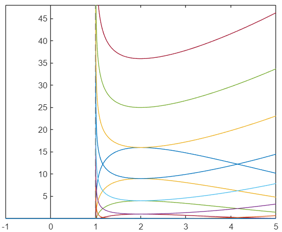 Nubrėžkite diferencialinės lygties atsakymą atkarpoje nuo -1 iki 5 ir pasirinkite taisyklingą atsakymą.