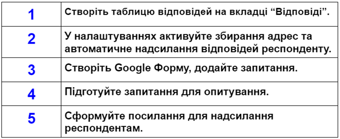 Установіть правильну послідовність дій для створення Google Форми з опитуванням.