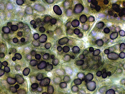 На фотографії препарат рослинної тканини оброблений розчином йоду. Вихзначте, що являють собою сині кульки, які помітні в клітинах: