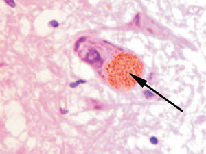 Перед Вами препарат нервової тканини. У нейроні виявлено гранули золотисто-коричневого кольору (вказані стрілкою). Що це таке?