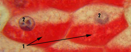На фотографії препарат клітин печінки зафарбований карміном. Визначте, що являють собою ділянки червоного кольору, позначені цифрою 1: