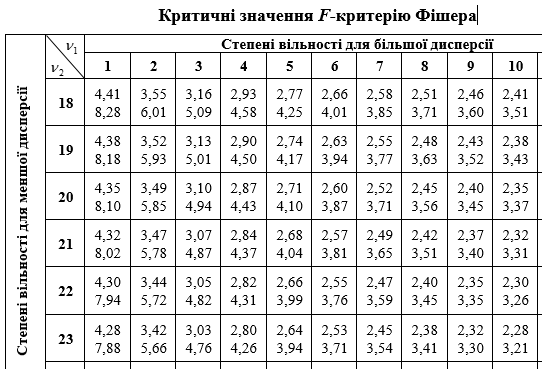 Для більшої дисперсії ν=10, для меншої дисперсії ν=18, чому дорівнює Fтабл. при р=0,95 ?