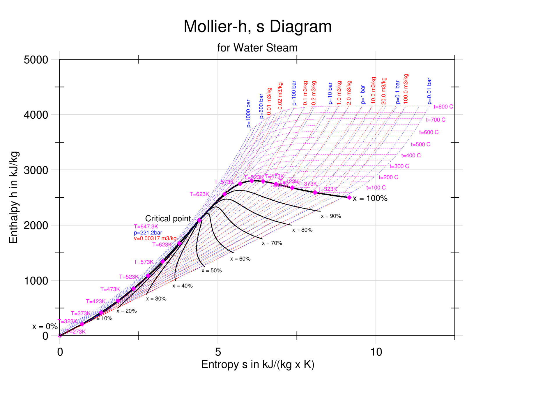 Figuren ovan är ett (s,h)-diagram för vatten. Bestäm med hjälp av diagrammet ångbildningsvärmet då vatten kokar vid 200 grader Celsius (473 kelvin)