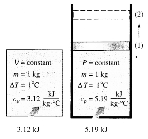 Figuren ovan visar två sätt att värma 1 kg av en 1 °C i ett slutet system. I alternativet till vänster är processen isokorisk, i alternativet till höger isobarisk.