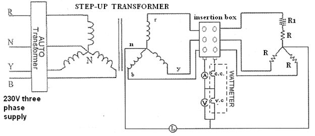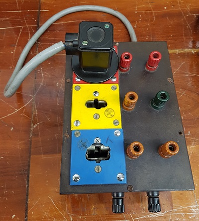 The insertion box below has three plug compartments (red, yellow and blue). There are short circuits between the pair of terminals at the side of each compartment. These short circuits allow the line currents to flow through the insertion box to the three phase load. When the plug of the insertion box is inserted into a compartment the short circuit corresponding to that compartment is replaced by whatever circuitry is connected across the black terminals.