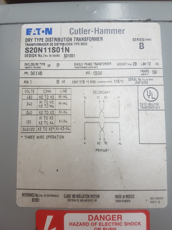 Calculate the 25% of the rated current (in AMPS) of the single phase transformer using the values on the name plate shown below. Assume the secondary rated voltage is 240 V.