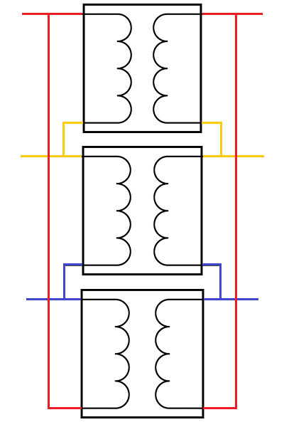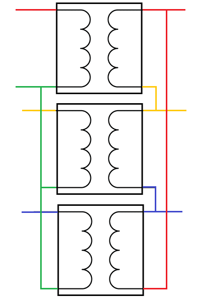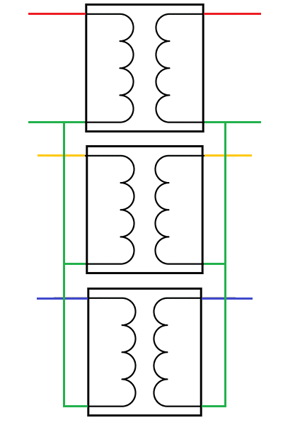 Three single phase transformers (picture below) can be connected together to form a single three phase transformer (the 4 diagrams below).