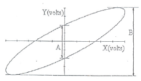 The phase angle between two sine waves can be determined from the Lissajous plot of these two waveforms when the oscillloscope is set to X-Y mode. The phase angle θ = sin-1(A/B) where A and B are defined in the diagram below.