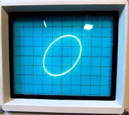 Determine the phase angle (in degrees) using the Lissajous plot on the oscilloscope screen below.