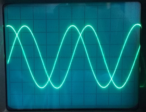 Determine the phase angle (in degrees) between the two sine waves displayed on the oscilloscope screen below.